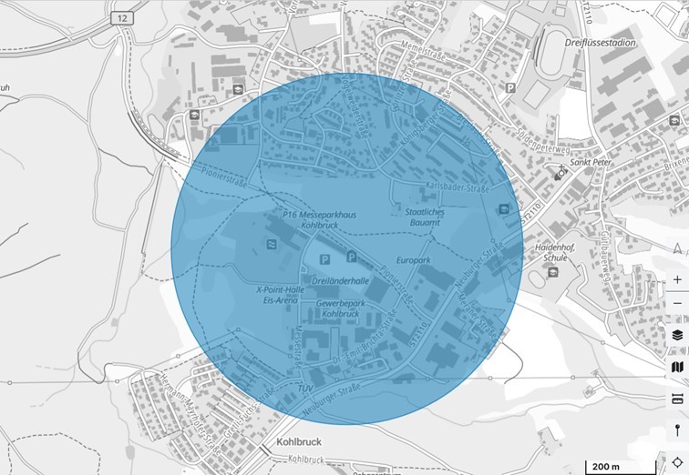 Das Gebiet wird durch einen Kreis mit dem Radius von 612 m (0,33 Nautische Meilen) begrenzt mit dem Mittelpunkt auf der Koordinate 48.55861N 13.41323E und erstreckt sich vom Boden bis 120 m über dem Boden.