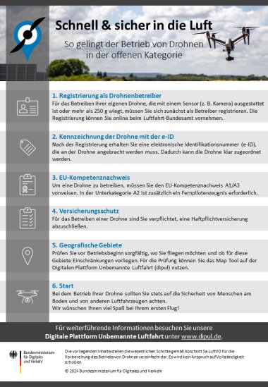 Sie möchten in Deutschland erstmals eine Drohne fliegen? Der Leitfaden "Schnell & sicher in die Luft" liefert Ihnen eine Übersicht über alle wesentlichen Schritte, die für Sie als Drohnenbetreiber in der offenen Kategorie relevant sind.